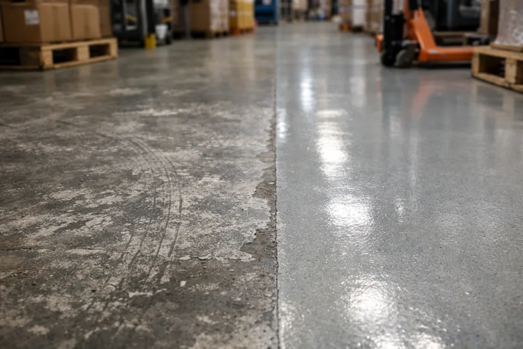 - Distribution warehouses: Polyaspartic extends floor life during forklift use and pallet movements.