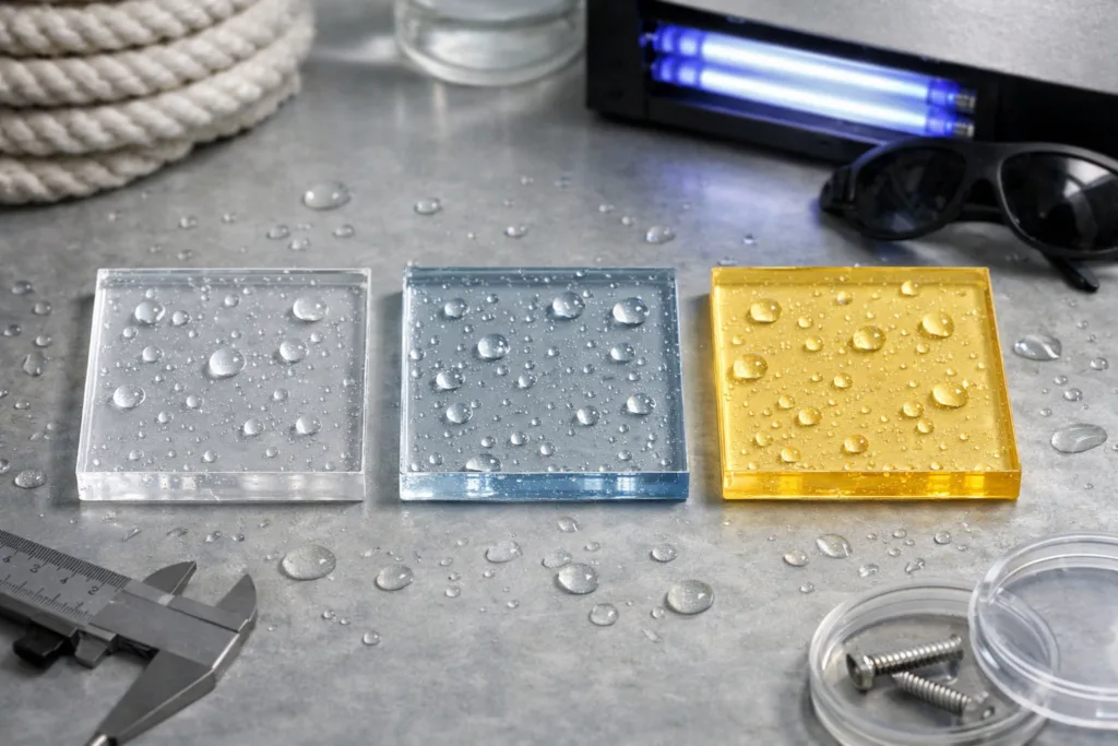 • UV resistance and yellowing index (Delta E or visual after exposure)