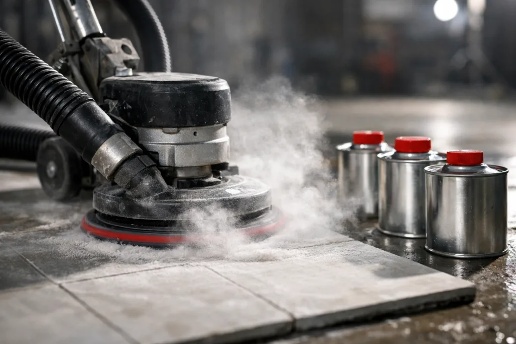 Sanding preparation is critical. Mechanical abrasion—using a rotary sander or diamond grinder—removes gloss and roughens the tile surface. The goal: a consistent matte profile for the adhesion promoter to grip. Vacuum all dust thoroughly after sanding.