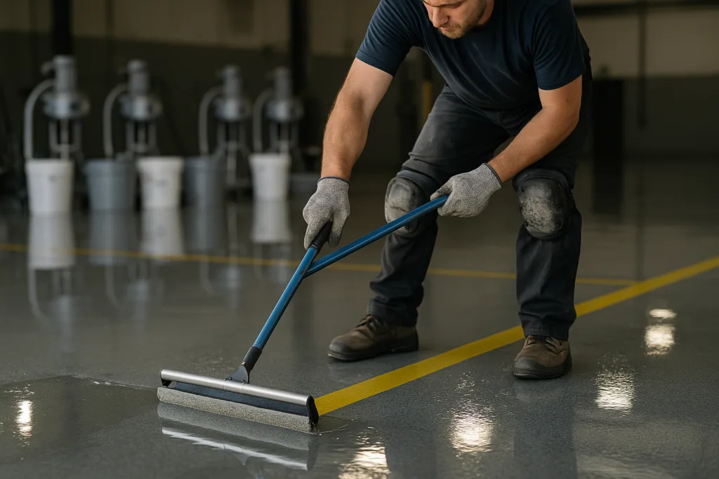Start with clean, dry, and well-prepped concrete or metal. Mix components accurately and use a roller, squeegee, or sprayer for uniform coverage.