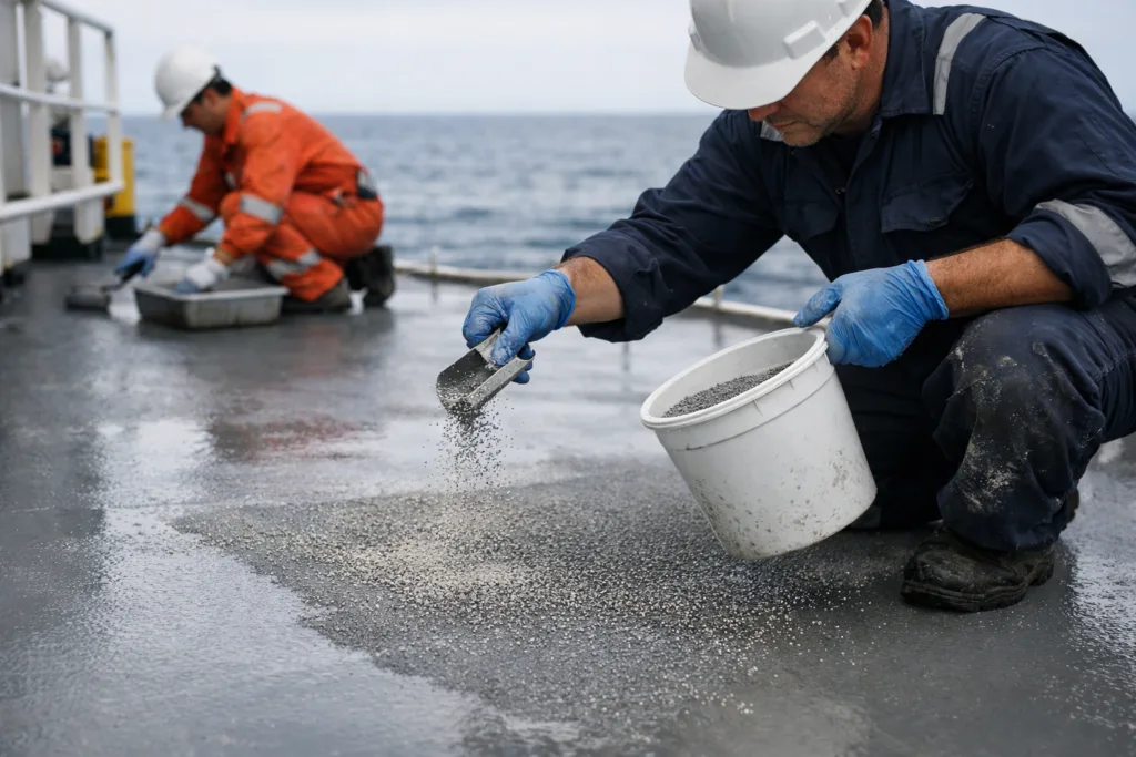 Safety underfoot is critical. Non-skid additives, often broadcast onto wet primer or base coat, provide slip protection in both wet and dry states. Choices include aluminum oxide, silica sand, or rubber granules for added softness. The grid size and coverage rate are tuned to match walking/working requirements: finer grains for passenger areas, coarser for working decks. Systems like anti-slip waterproof coating for wet areas walk through proven strategies for balancing slip protection with easy-to-clean deck surfaces.