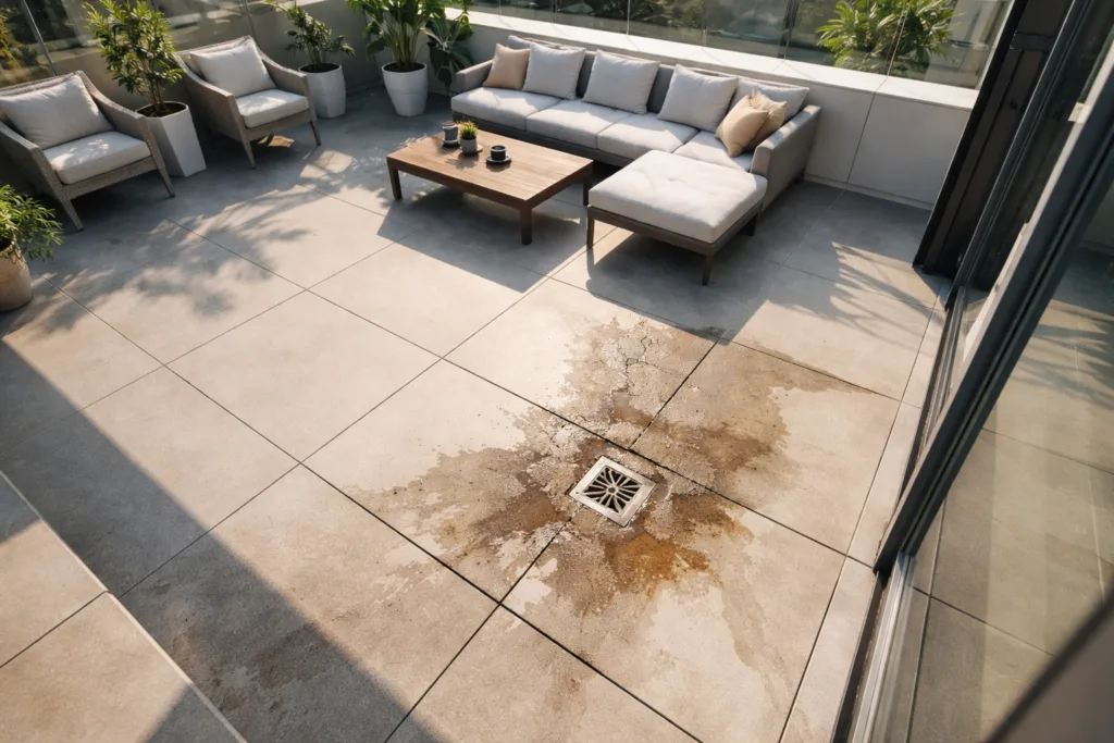 Outdoor surfaces often suffer silently, especially where water can pool or drainage is poor. Watch for white streaks, flaking, or popping tiles on terraces and balconies. For stone or resin-bound systems, mildew or granular loss flag water trapped beneath. Explore terrace balcony outdoor floor coating methods for upgrades.