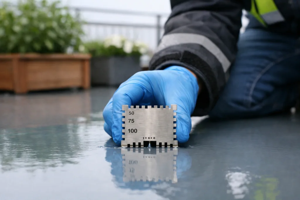 After application, check selected points with a wet film comb or dry thickness gauge. Troublesome areas—corners, drains, cracks—need extra attention. For ongoing maintenance, inspect for physical wear and recoat at intervals to maintain minimum thickness.